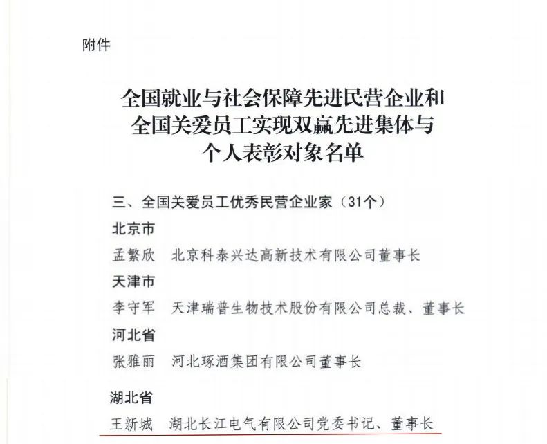 近日,中华全国工商业联合会、中华人民共和国人力资源和社会保障部、中华全国总工会发布《关于表彰全国就业与社会保障先进民营企业和全国关爱员工实现双赢先进集体与个人的决定》,长江电气党委书记、董事长王新城荣获湖北省唯一“全国关爱员工优秀民营企业家”称号,长江电气员工张作顿荣获湖北省唯一“全国热爱企业优秀员工”称号。