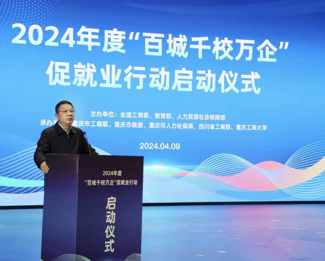 4月9日,由全国工商联、教育部、人力资源和社会保障部主办,重庆市工商联、重庆市教委、重庆市人力社保局、四川省工商联、重庆工商大学承办的2024年度“百城千校万企”促就业行动启动仪式在重庆举行。长江电气受邀参加启动仪式,公司党委书记、董事长王新城作为全国三位企业家代表之一交流发言。