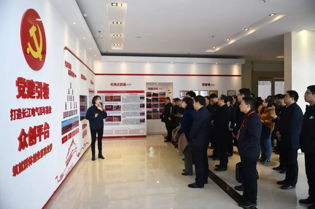 在长江电气党委书记、董事长王新城的陪同下,考察团一行首先参观了长江电气长运娱乐展厅,深入了解企业的发展历程、领导关怀、科创成果、重大客户、社会责任等。在党建展厅,考察团一行观看了以《旗帜引领迈向新征程》为主题的党建宣传片,详细了解了长江电气“一二三四”党建工作法,即通过扛起“一面旗帜”、夯实“两块基石”、建强“三支队伍”、打造“四个品牌”,通过“党建引领”、“众创平台”的重点介绍,全面展示了长江电气在“党建引领”下取得的辉煌成就。