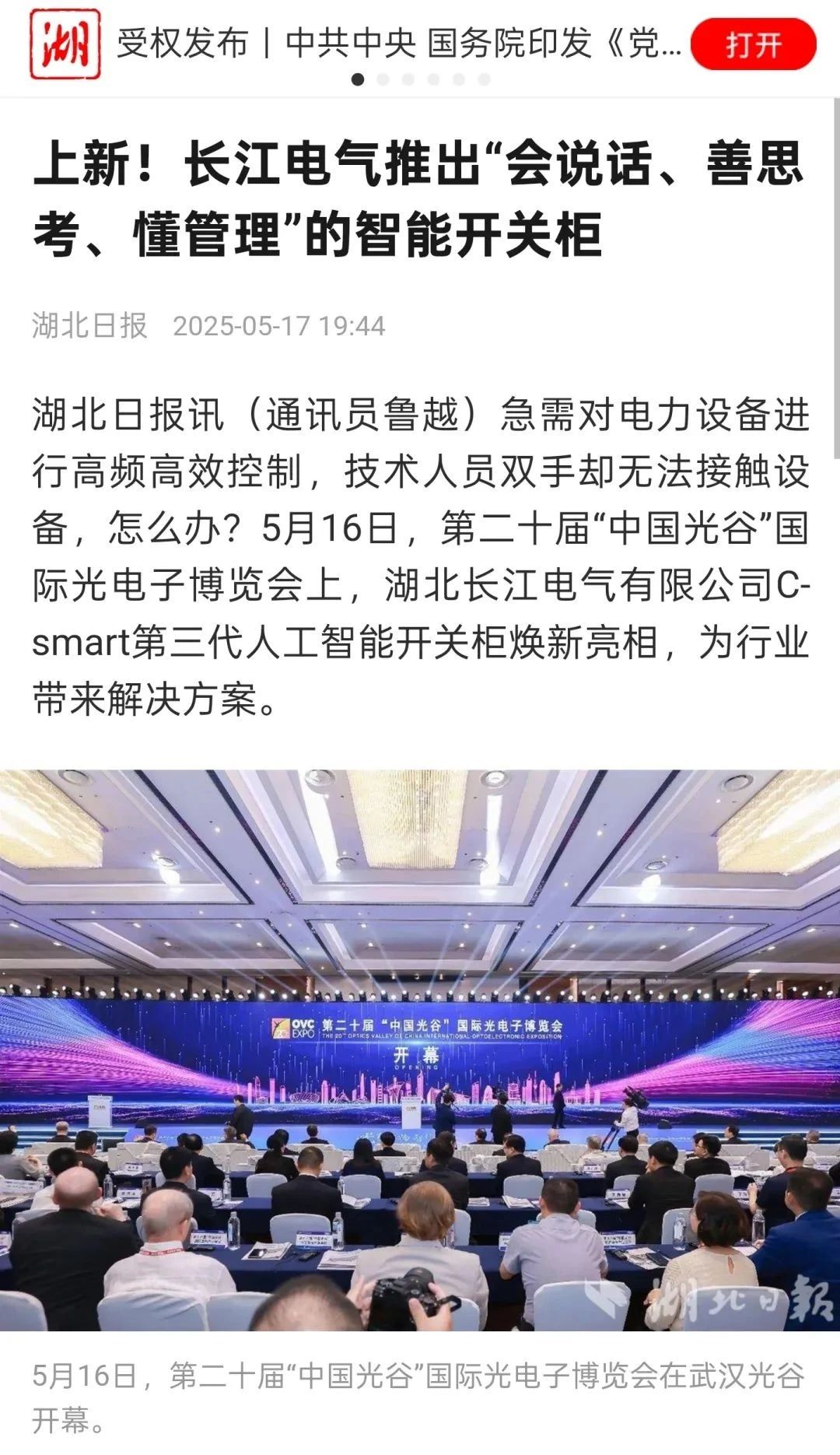5月16日,第二十届武汉光博会及第三届“中国光谷”智慧能源产业高质量发展大会在中国光谷隆重举行,C-Smart第三代人工智能开关柜系列产品重磅发布,得到社会各界广泛关注,并获多家媒体聚焦报道。