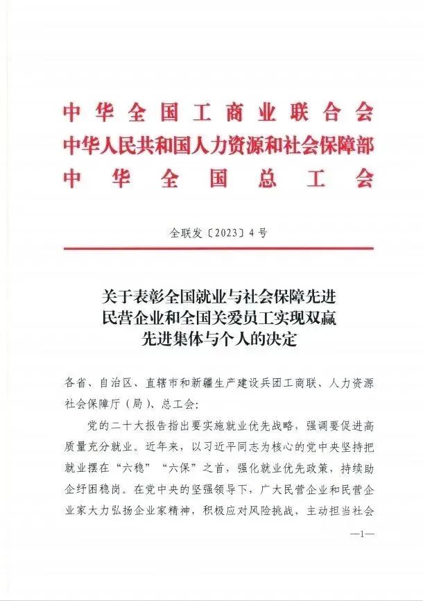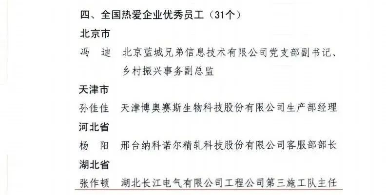 近日,中华全国工商业联合会、中华人民共和国人力资源和社会保障部、中华全国总工会发布《关于表彰全国就业与社会保障先进民营企业和全国关爱员工实现双赢先进集体与个人的决定》,长江电气党委书记、董事长王新城荣获湖北省唯一“全国关爱员工优秀民营企业家”称号,长江电气员工张作顿荣获湖北省唯一“全国热爱企业优秀员工”称号。
