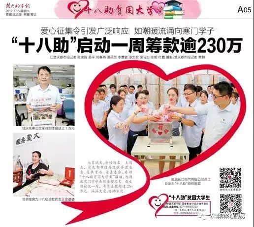 致富思源,反哺社会,积极参与助学、赈灾、关爱留守儿童、关爱老人、助力城市发展等公益事业,不仅是和谐企业的需要,更是一份社会责任。近年来公司赞助武汉网球公开赛、参与《楚天都市报》“十八助”爱心助学活动、为阿拉善•SEE拯救江豚项目捐款等,还受到媒体广泛关注。