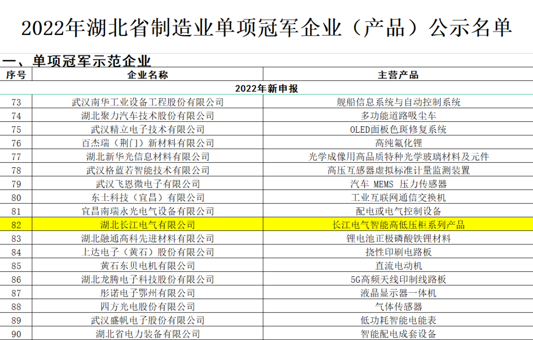 近日,湖北省经济和信息化厅发布了《关于2022年湖北省制造业单项冠军企业(产品)名单的公示》文件,长江电气经过层层严格评审成功上榜,凭借长江电气智能高低压柜系列产品,荣获“2022年湖北省制造业单项冠军企业”荣誉称号。