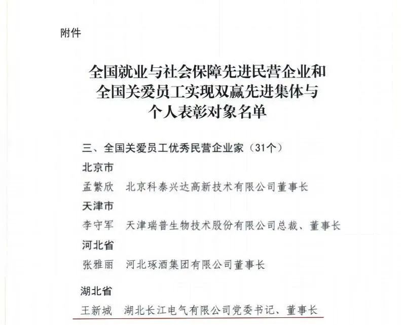近日,中华全国工商业联合会、中华人民共和国人力资源和社会保障部、中华全国总工会发布《关于表彰全国就业与社会保障先进民营企业和全国关爱员工实现双赢先进集体与个人的决定》,长江电气党委书记、董事长王新城荣获湖北省唯一“全国关爱员工优秀民营企业家”称号,长江电气员工张作顿荣获湖北省唯一“全国热爱企业优秀员工”称号。